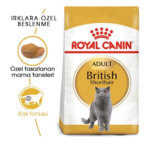 British Shorthair kedilerinin çene ve ağız yapılarına uygun tanecikleri olan Royal Canin British Shorthair, kas kütlesinin yoğunluğunu koruyacak protein seviyesine sahiptir ayrıca içeriğinde bulunan kalsiyum diş sağlına olumlu etki eder.